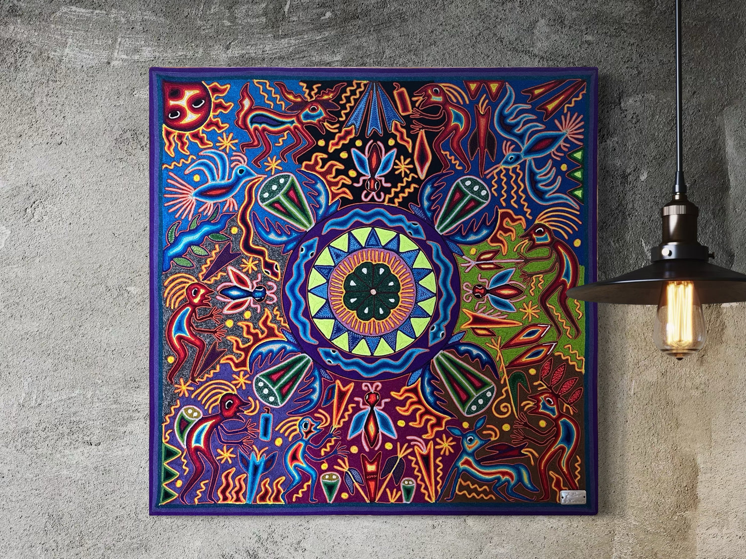 Art Huichol.- La fabrication des tableaux de fil Huichol sont de véritables peintures de fils multicolores, le fil est collé avec de la cire de Campeche (cire d'abeille), où les Huichols expriment les visions qu'ils ont lors de leurs rituels, leurs histoires et leur religion.