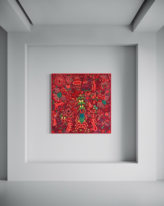 Este cuadro de estambre huichol en intensas tonalidades rojas representa una escena ceremonial de profunda raíz ancestral. Dos chamanes curanderos celebran y agradecen al maíz, fuente de vida y equilibrio, ofreciendo peyotes como símbolo de visión, sanación y conexión espiritual. Alrededor, el venado sagrado guía el camino del espíritu, las águilas elevan las oraciones hacia el cielo y el sol preside la escena como energía creadora y protectora.